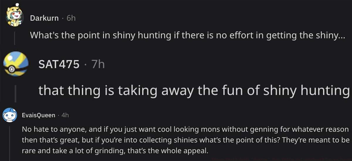 The core conflict centers on fundamentally different perspectives about achievement legitimacy in gaming. Detractors argue that Shiny Pokemon derive their value from the substantial effort investment required for acquisition, with one critic noting “What’s the point in shiny hunting if there is no effort in getting the shiny…” Another participant suggested the technology “is taking away the fun of shiny hunting,” while a third emphasized that rarity and grinding constitute “the whole appeal” of Shiny collection.