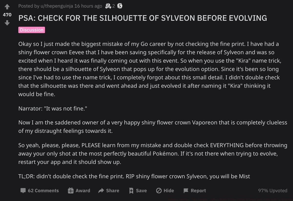 The Reddit thread revealed thepenguinja wasn’t alone. Numerous trainers shared similar stories of Sylveon evolution mishaps. “I sacrificed my perfect IV Eevee to the wrong evolution,” lamented one commenter. Others admitted rushing the process without proper verification.