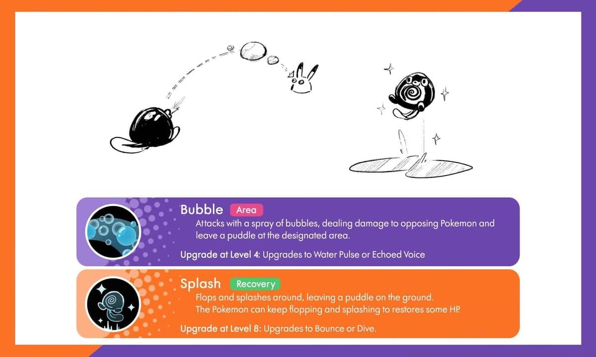 Despite its small stature, Poliwag can overwhelm larger opponents through strategic ability usage. Poliwag accesses Bubble and Splash as its initial move options. Bubble damages opponents while generating additional puddles at impact locations, expanding terrain control. Splash provides exceptional mobility, allowing Poliwag to swiftly engage or disengage from combat. This movement ability enables aggressive pursuit of weakened targets or strategic retreats when overwhelmed. Upon evolving into Poliwhirl then Politoed, trainers choose between upgrading Bubble into Water Pulse or Echoed Voice. Water Pulse launches a long-range water projectile that damages and repels enemy Pokemon. At maximum range, it detonates to stun surrounding opponents while creating yet another puddle zone.