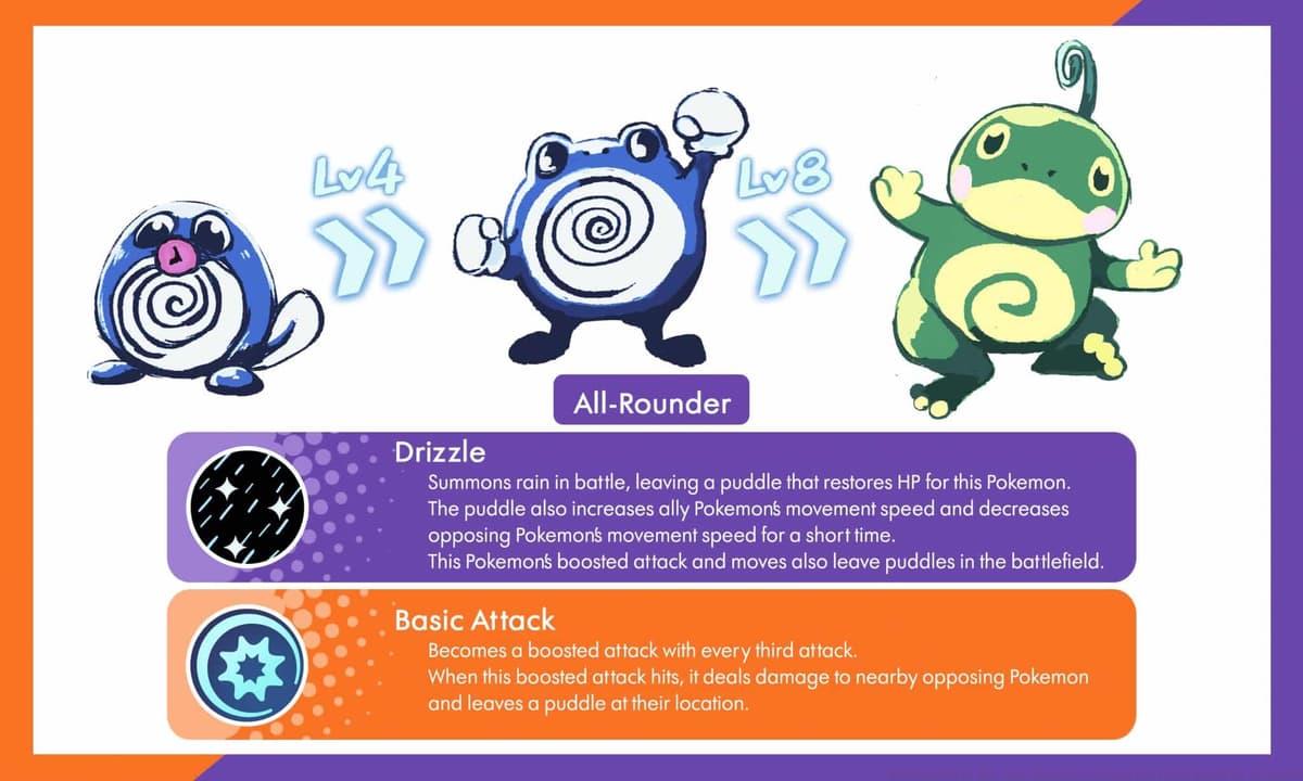 Poliwag and Poliwhirl demonstrate surprising combat prowess despite their size. Following Blastoise and Blissey’s arena debut, Owlydowly designed Politoed as a ranged All-Rounder beginning as Poliwag. The Drizzle ability provides passive health regeneration while accelerating allied Pokemon movement speed, creating early-game lane sustainability. This makes Poliwag exceptionally resilient during the crucial first minutes when securing wild Pokemon experience.