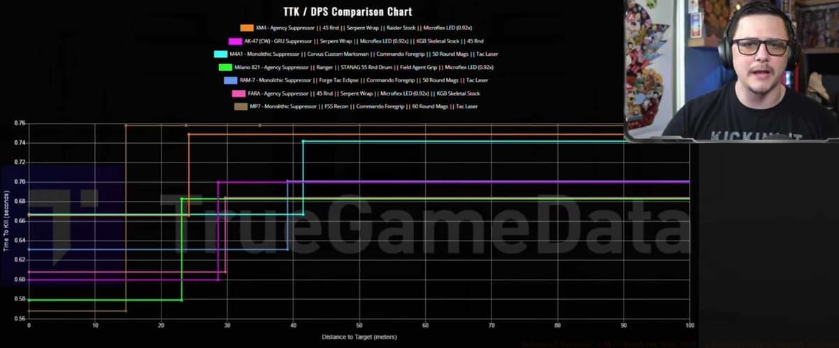 JGOD’s detailed TTK analysis (shown above) demonstrates how these weapons compare across different engagement scenarios. While the video examines all hitboxes, chest shot data proves most valuable since it represents typical aiming behavior.