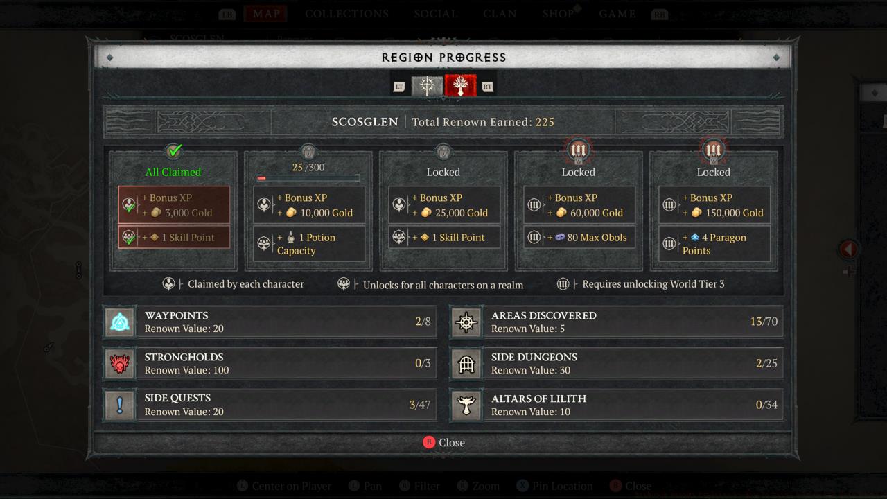 1TL;DR Renown provides permanent account-wide bonuses across all five Sanctuary regions Six activities earn points: Strongholds (100), Dungeons (30), Side Quests (20), Waypoints (20...