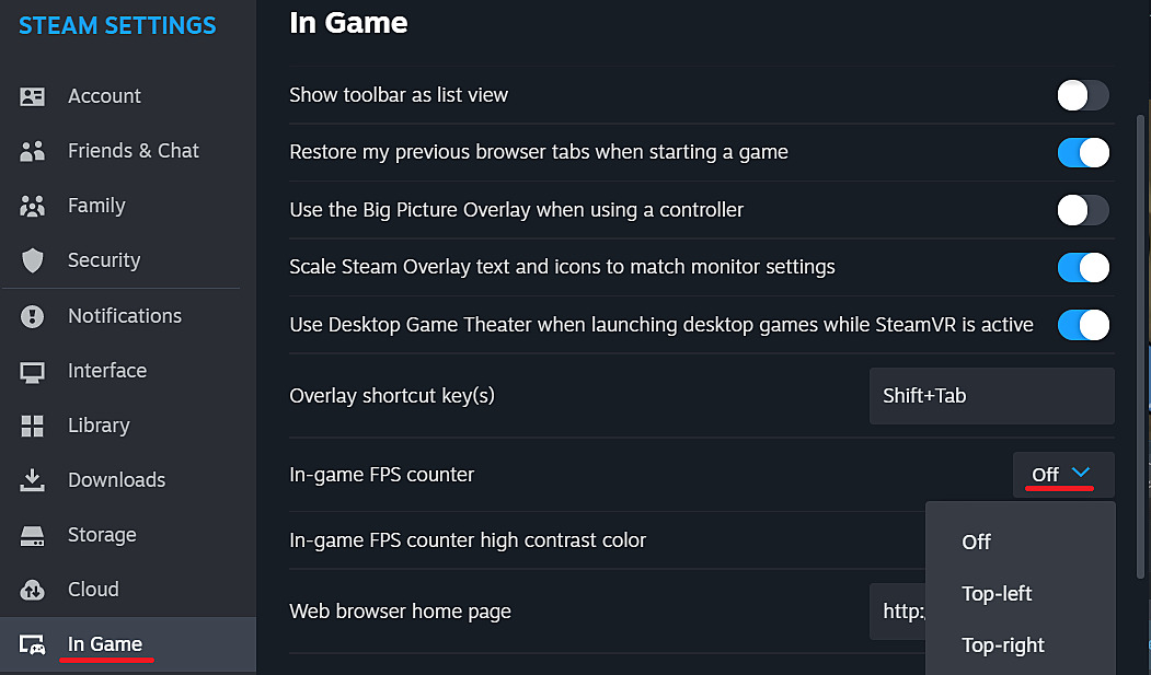 - Configure Steam overlay FPS counter through Settings → In-Game menu