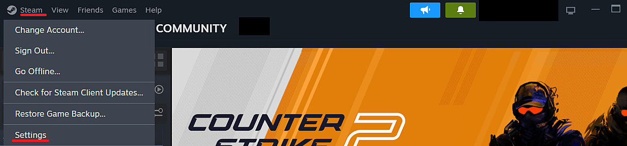 - Launch Steam client and navigate to Steam → Settings menu