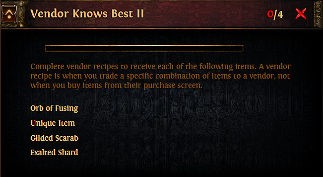 No reproduction without permission:SeeYouSoon Game Club » Vendor Knows Best II challenge guide The Forbidden Sanctum PoE. Orb of Fusing, Unique item, Gilded Scarab, Exalted shard vendor recipes Master vendor recipes for Orb of Fusing, Unique items, Gilded Scarabs, and Exalted Shards in Path of Exile's Forbidden Sanctum