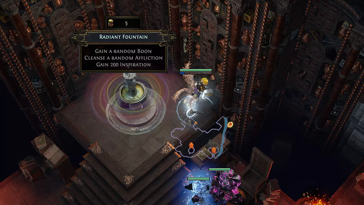 The exceptional rarity of Radiant Fountain is justified by its comprehensive benefits package. For a modest investment of 5 Aureus coins, this feature delivers three distinct advantages: it bestows a randomly selected Boon, eliminates one random Affliction from your current loadout, and additionally provides a substantial 200 Inspiration boost. While the random nature means outcomes can vary between runs, the cumulative value consistently proves exceptional for run recovery.