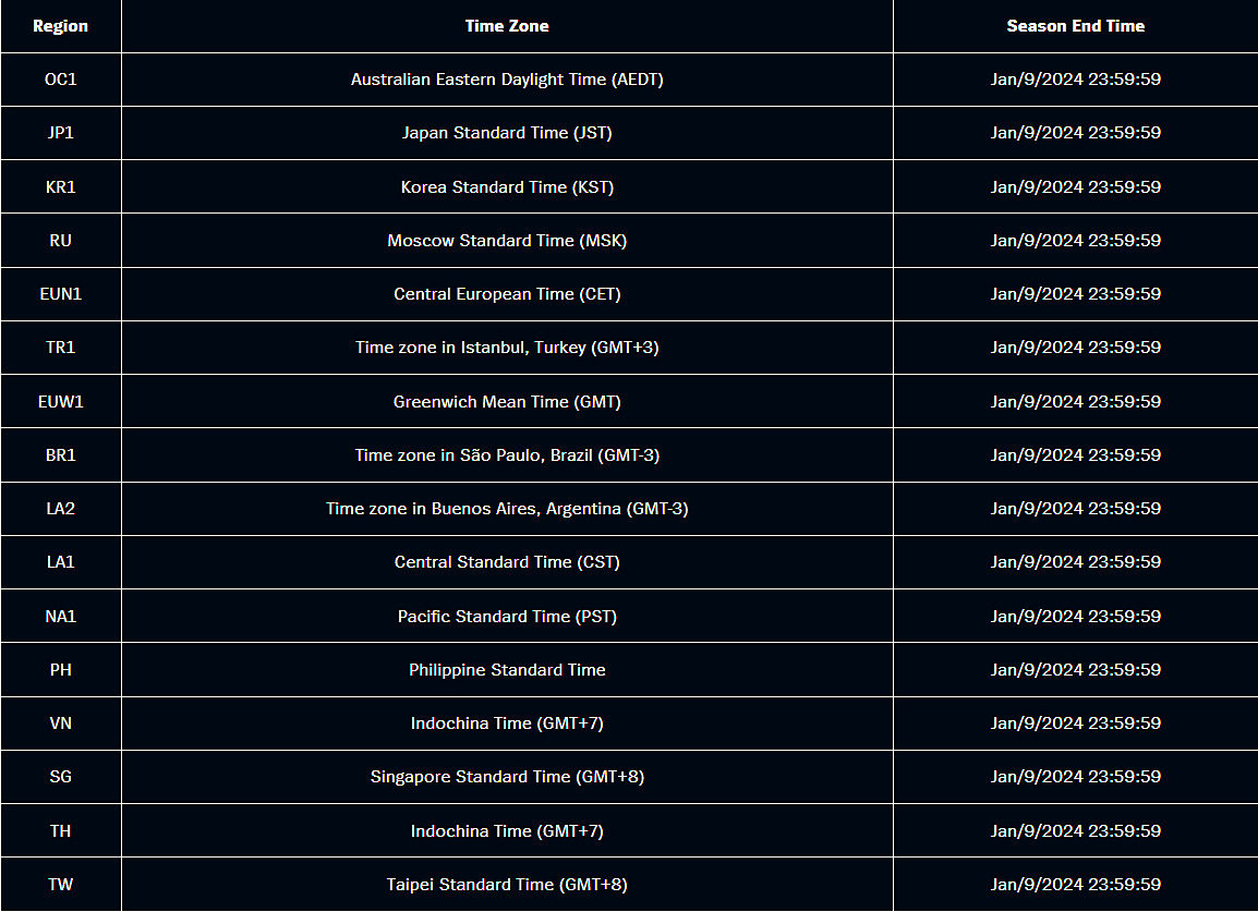 - Season 2023 Split 2 ends January 9, 2024 at 23:59:59 local time globally