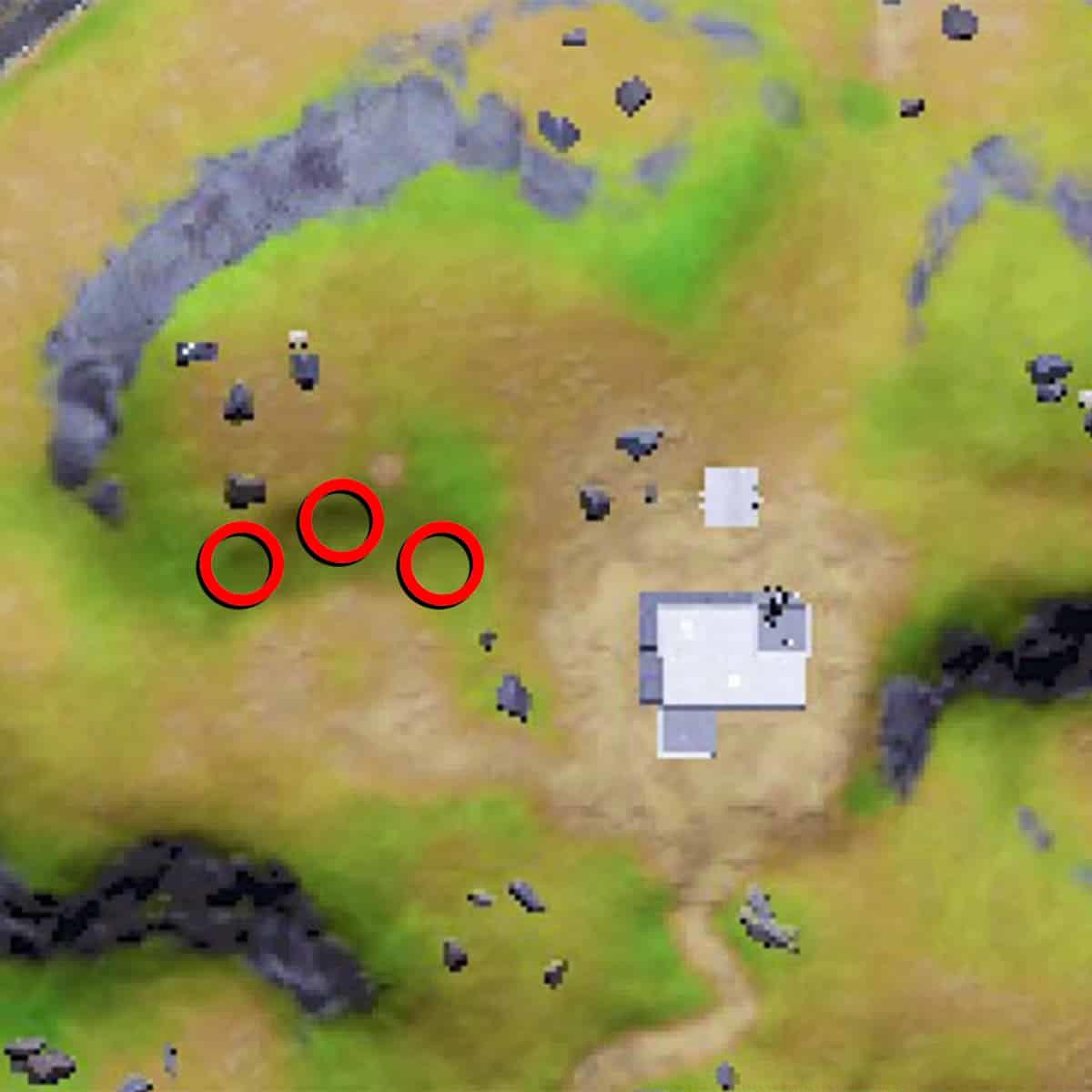 Linear planting arrangement at FN Radio. FN Radio resides east of Craggy Cliffs, just north of an IO Base installation. Mirroring the efficient layout of the Food Truck location, all three planting spots at FN Radio form a linear pattern on the hill west of the main structure. This organized placement allows for rapid sequential planting with minimal movement between positions.