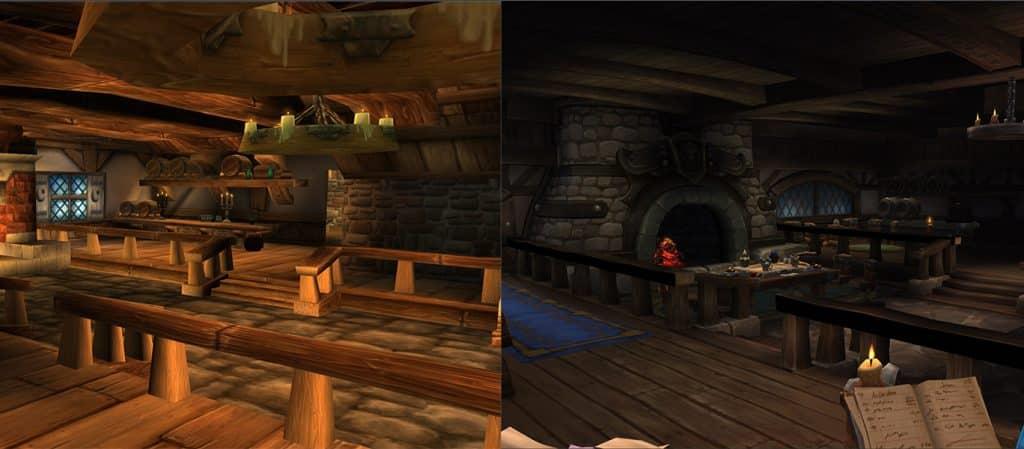 The apparent color variation stems from these models not yet being integrated into the live game environment, meaning they lack illumination from WoW’s dynamic lighting systems that affect existing structures. This lighting discrepancy becomes particularly evident when examining the interior of the updated inn, which demonstrates clear improvements to texturing and modeling but appears unusually dark without the characteristic fireplace glow that typically defines these spaces.